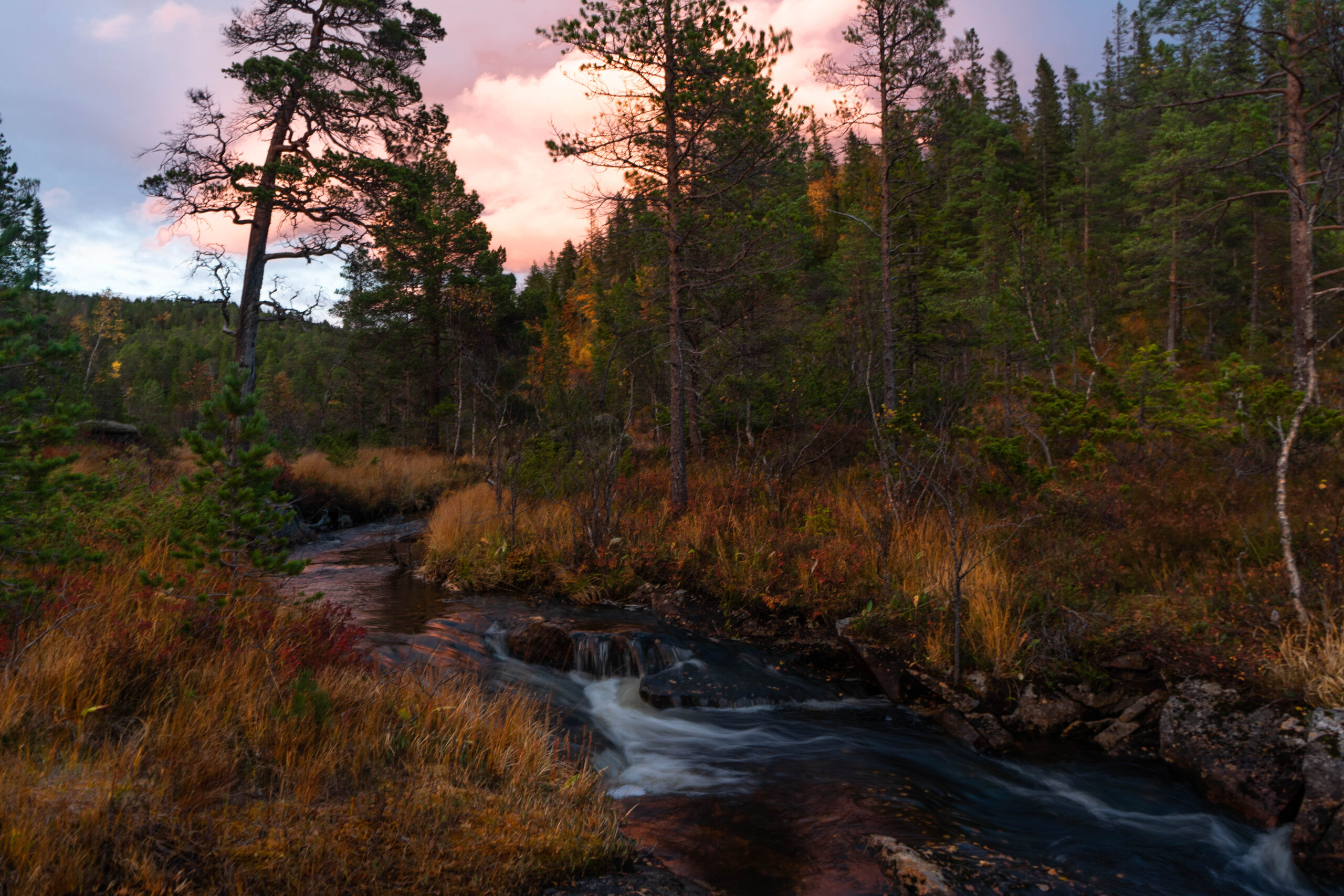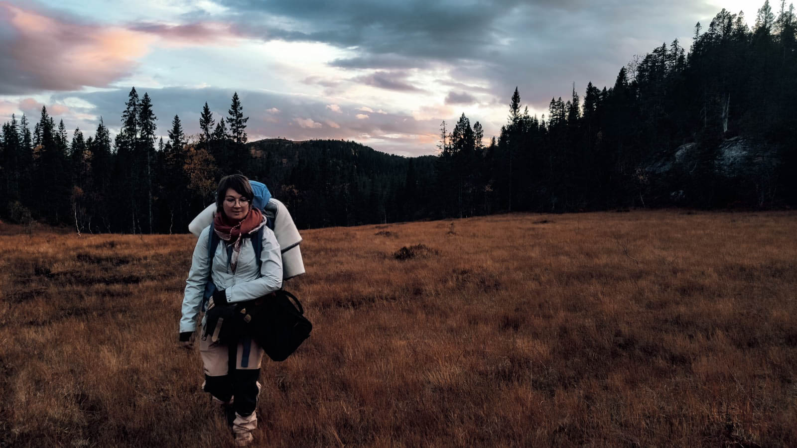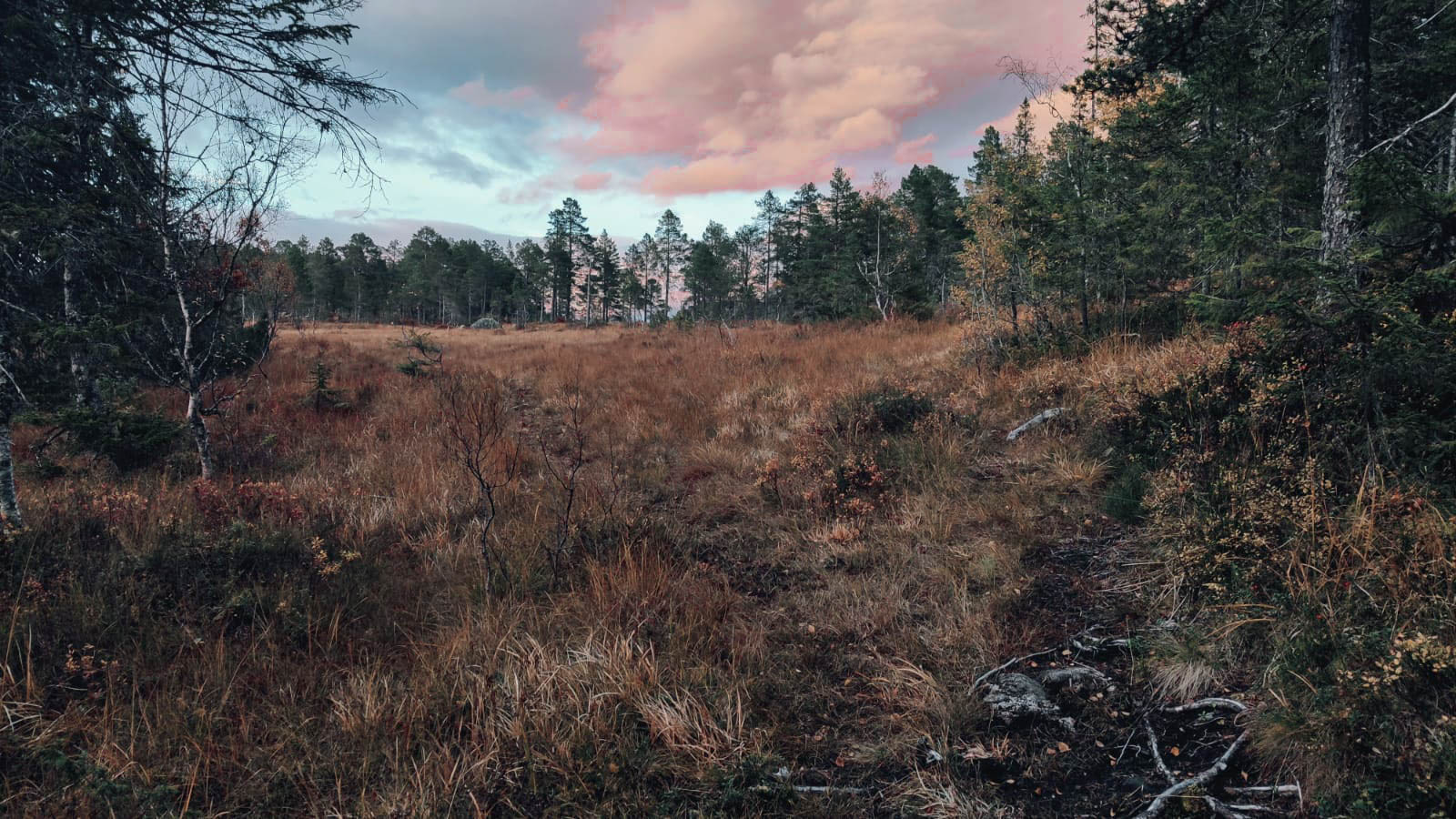Am Wochenende sind wir zu unserer ersten Hyttetur aufgebrochen. Mit Angel im (viel zu schweren) Gepäck sind wir drei Kilometer zu einer einsamen Hütte auf einer Insel im Moor gewandert. Drei Kilometer klingen eigentlich nicht sonderlich anstrengend, kommen einem aber im Zwielicht bergauf durchs Moor sehr weit vor. Die Hütte ist am Schnellsten und komfortabelsten übers Wasser erreichbar da sie sich auf einer Halbinsel befindet . Zumindest in der Theorie. Es gibt zwar Land, dass die Hütte mit dem Bootsanleger verbindet, doch das wäre ein großer Umweg. Und für Umwege ist das Abendrot schon zu weit fortgeschritten.