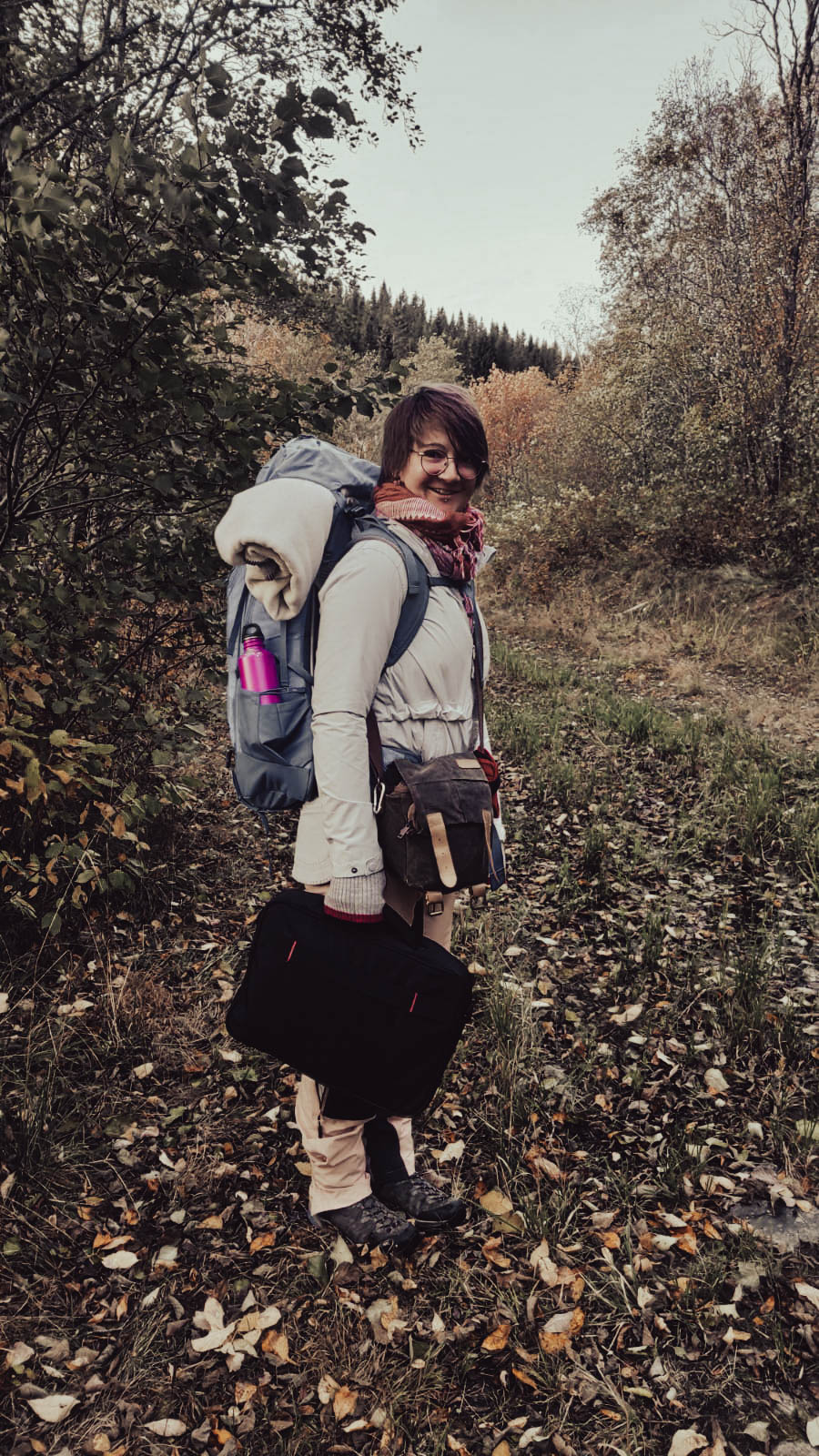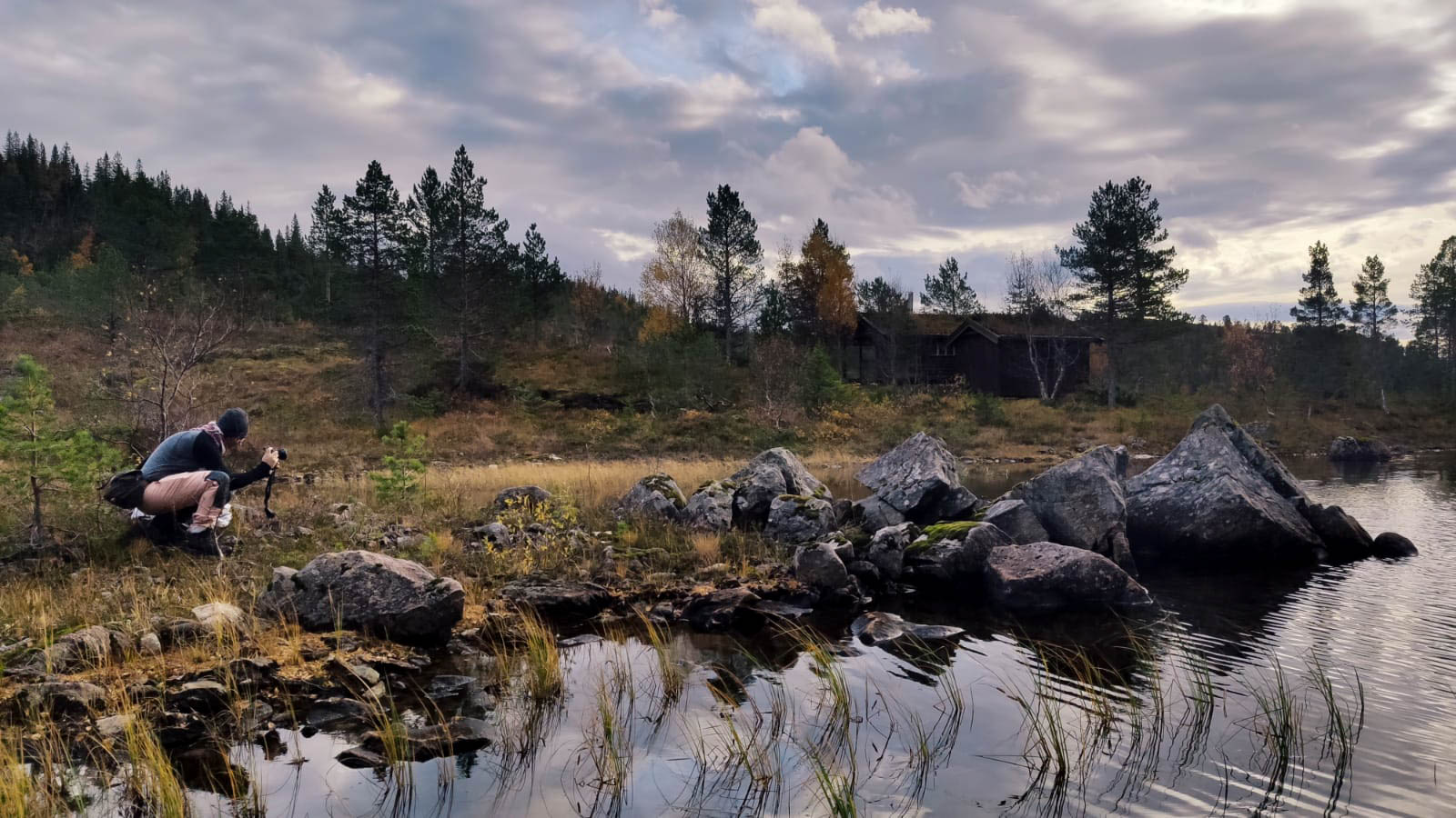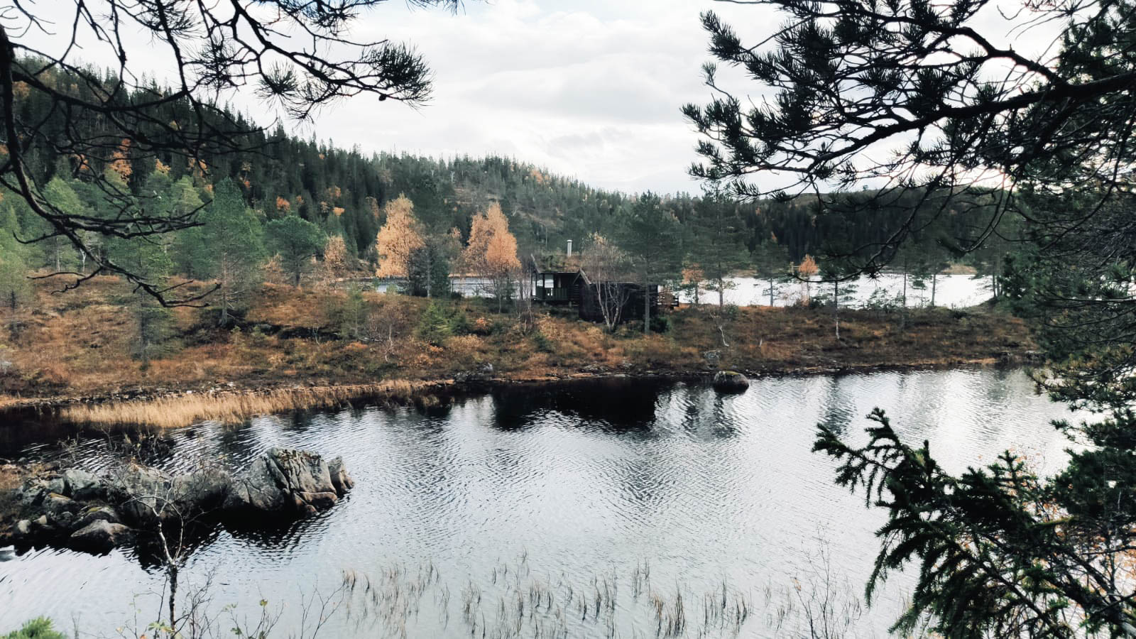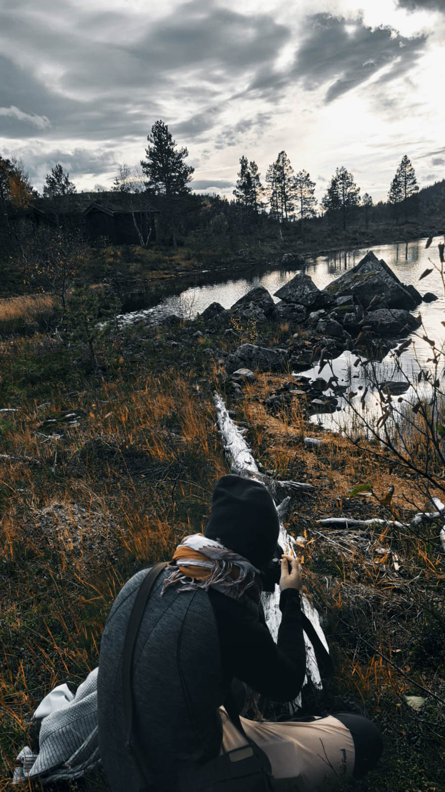Der Tag macht das Rudern weniger bedrohlich und man hat Zeit, seinen eigenen Rhythmus zu finden. Es ist ganz still, wir hören nur das Ruder, das im Wasser bricht. Das Rudern ist ziemlich anstrengend und wir pausieren, um unsere Umgebung auf dem Landweg zu erkunden. Vorher finden wir jedoch im Schrank eine Lösung für unser Fliegenproblem. Eine Räucherspirale. Wir zünden diese an, öffnen Fenster und Türen, wie es in der Anleitung steht, und brechen auf. Viel Moor, viel Ruhe und viele bunte Herbstfarben. Wir finden eine Bergquelle und füllen unsere Wasserflaschen auf. Da das Wetter heute keinen Spaß macht und es um uns herum keine angelegten Wanderwege gibt drehen wir zeitig um. Als wir in die Hütte zurückkehren feiern die Fliegen gerade eine Party in unserer Hütte. Ganze Großfamilien wurden durch den Rauch aus den Ritzen im Holz gelockt. Nun wissen wir auch, wieso die Fenster geöffnet werden sollten. Nicht, wie vermutet, um den Rauch abziehen zu lassen sondern um einen Fluchtweg für die Fliegen zu schaffen. Das funktioniert ganz gut und bald sind wir fast fliegenfrei. Marcel beschließt nun, seine Angel auszuprobieren und ich schreibe ein paar Zeilen. Die Fische sind zu erschöpft um anzubeißen und mein Akku tut es ihnen schnell gleich.
