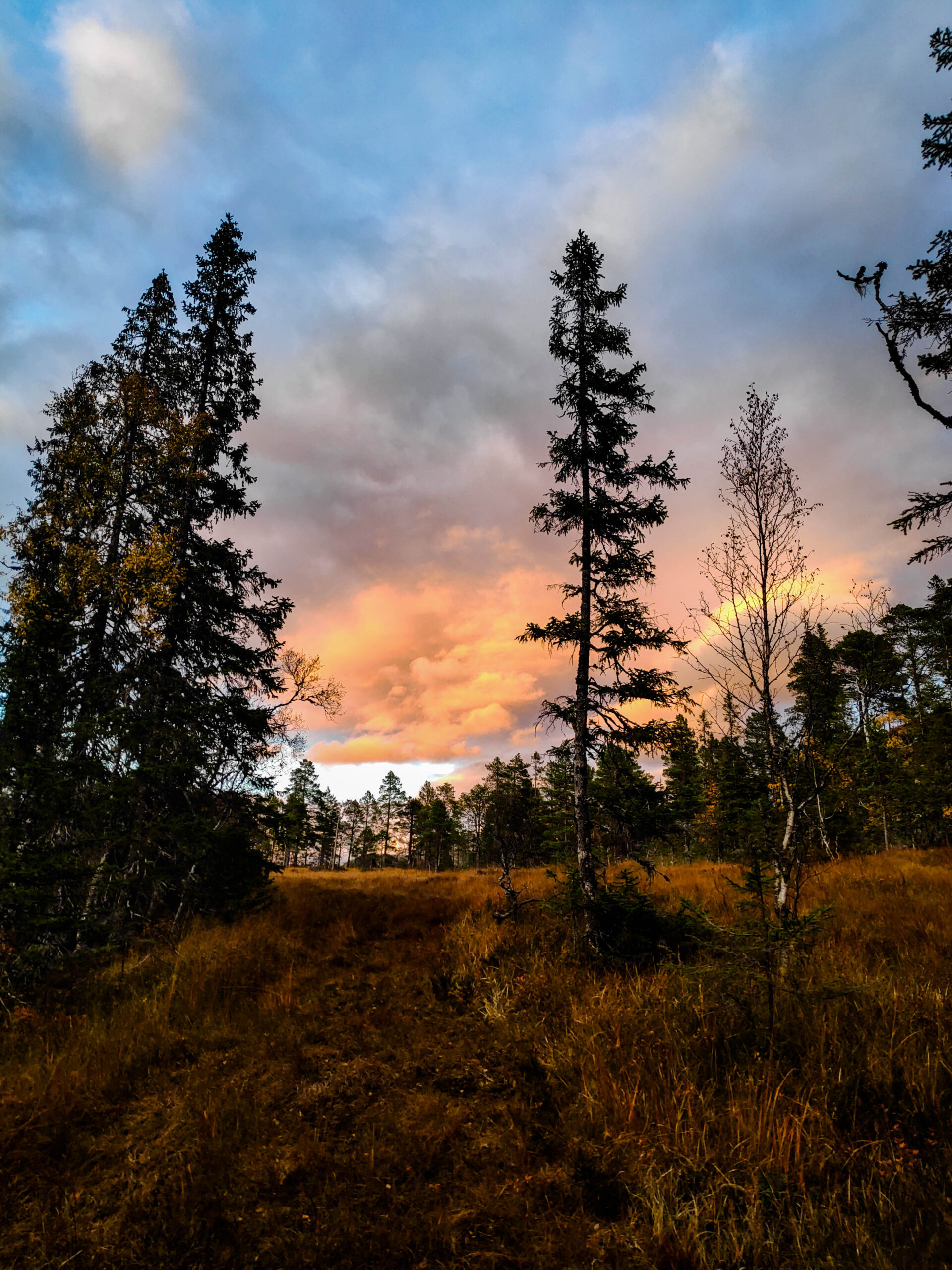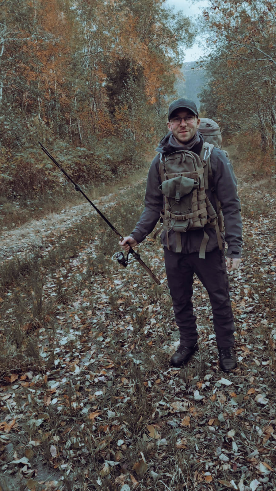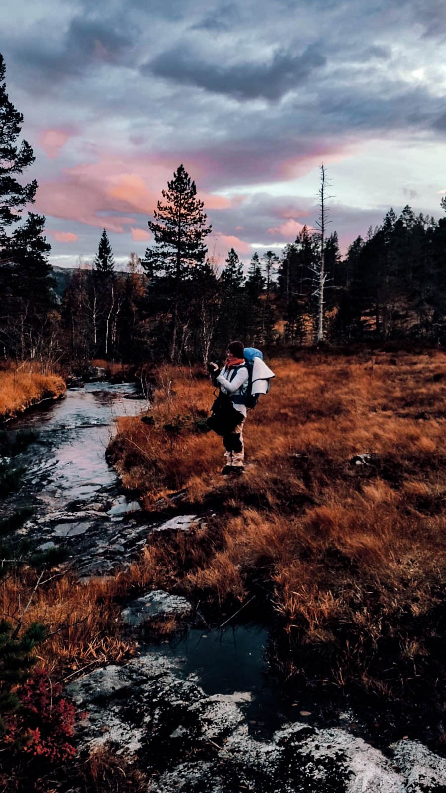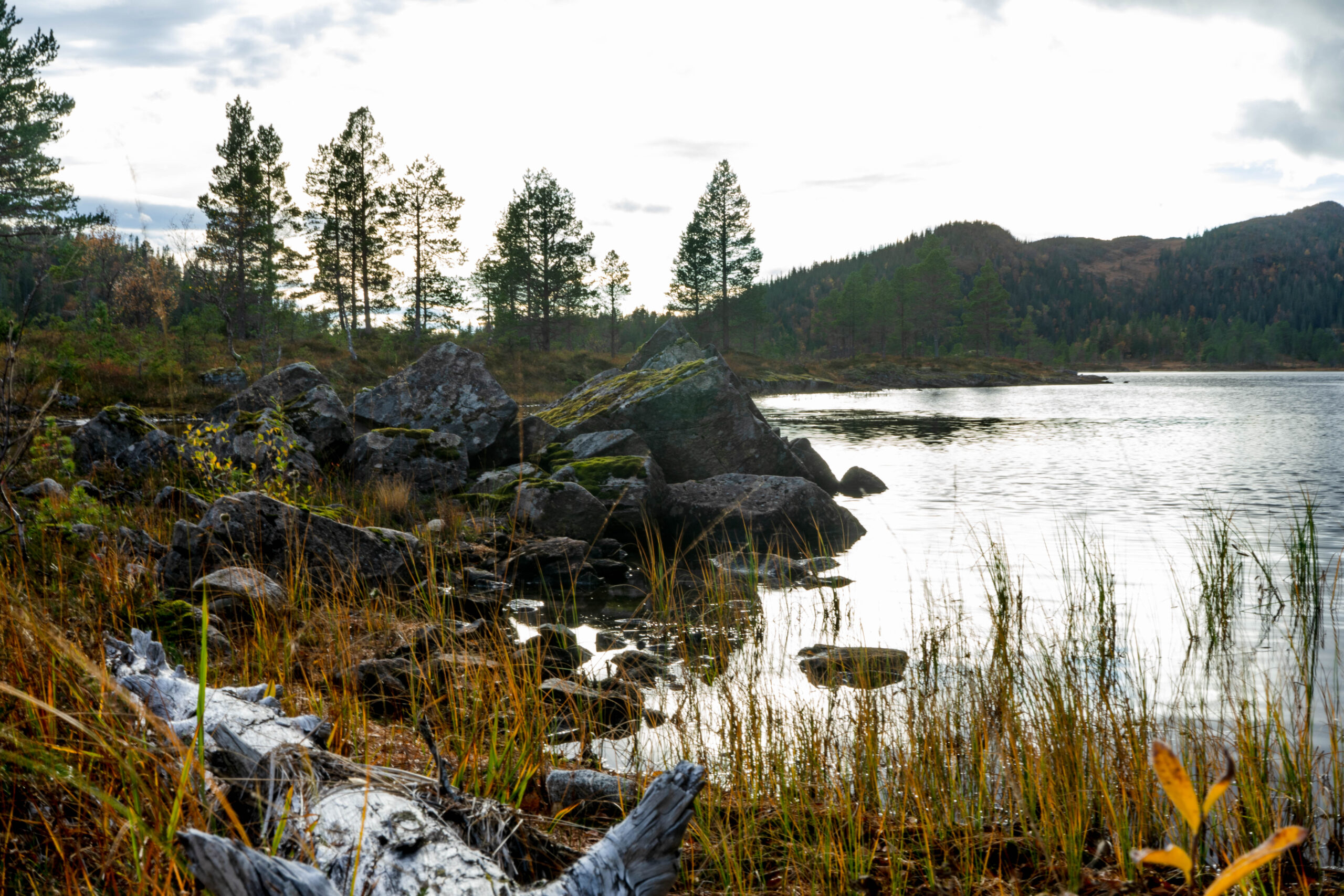 Der Tag macht das Rudern weniger bedrohlich und man hat Zeit, seinen eigenen Rhythmus zu finden. Es ist ganz still, wir hören nur das Ruder, das im Wasser bricht. Das Rudern ist ziemlich anstrengend und wir pausieren, um unsere Umgebung auf dem Landweg zu erkunden. Vorher finden wir jedoch im Schrank eine Lösung für unser Fliegenproblem. Eine Räucherspirale. Wir zünden diese an, öffnen Fenster und Türen, wie es in der Anleitung steht, und brechen auf. Viel Moor, viel Ruhe und viele bunte Herbstfarben. Wir finden eine Bergquelle und füllen unsere Wasserflaschen auf. Da das Wetter heute keinen Spaß macht und es um uns herum keine angelegten Wanderwege gibt drehen wir zeitig um. Als wir in die Hütte zurückkehren feiern die Fliegen gerade eine Party in unserer Hütte. Ganze Großfamilien wurden durch den Rauch aus den Ritzen im Holz gelockt. Nun wissen wir auch, wieso die Fenster geöffnet werden sollten. Nicht, wie vermutet, um den Rauch abziehen zu lassen sondern um einen Fluchtweg für die Fliegen zu schaffen. Das funktioniert ganz gut und bald sind wir fast fliegenfrei. Marcel beschließt nun, seine Angel auszuprobieren und ich schreibe ein paar Zeilen. Die Fische sind zu erschöpft um anzubeißen und mein Akku tut es ihnen schnell gleich.