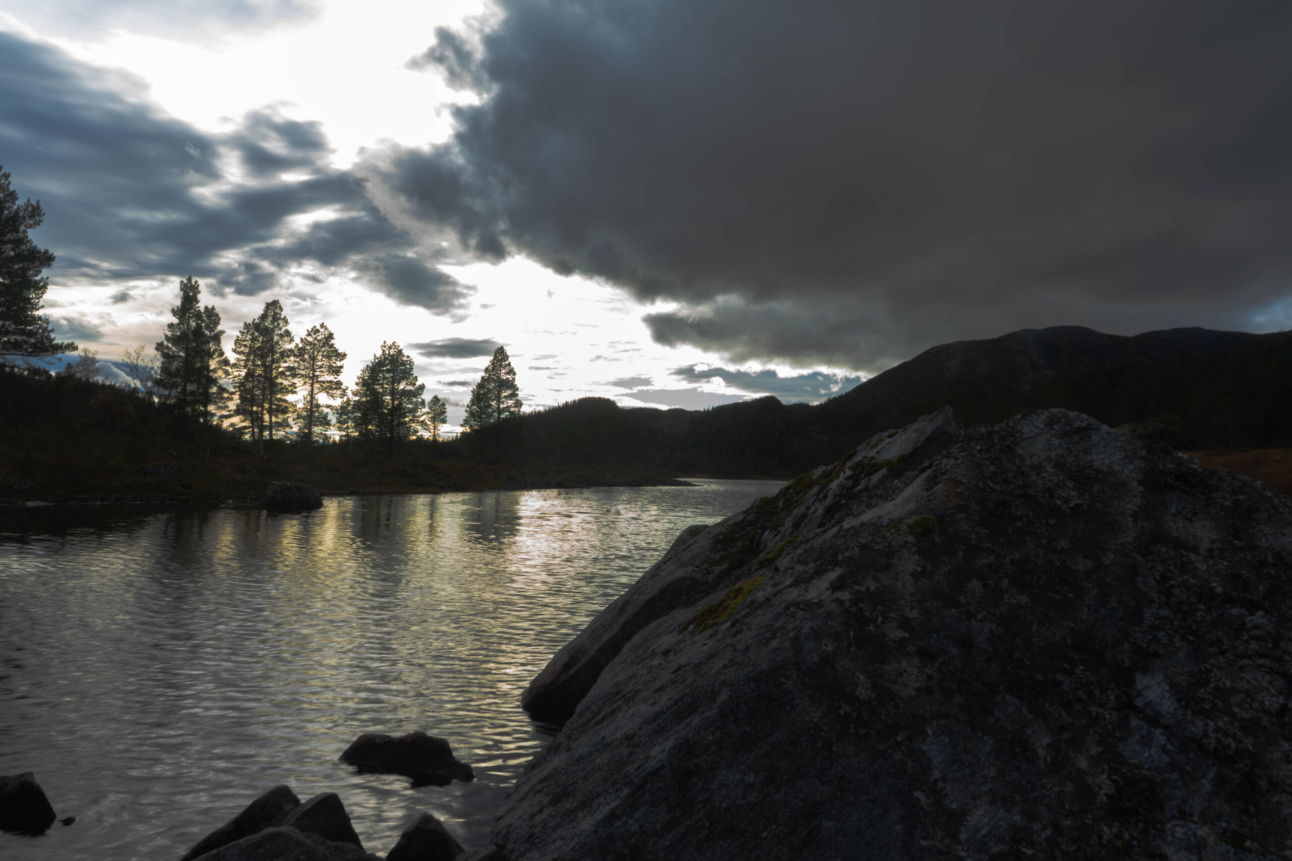 Bevor wir unser Gepäck auspacken begeben wir auf die Suche nach der Toilette. Laut Beschreibung soll es ein Plumpsklo geben doch im Schuppen neben der Hütte finden wir nur Holz. Wir kreisen eine Weile im Regen um die Hütte herum, die Nacht nur erhellt vom Handylicht, der Mond versteckt sich hinter Wolken. Nach ungefähr 15 Minuten des Umherirrens finde ich das Toilettenhäuschen ca. 300 Meter von der Hütte entfernt. Zu weit, um nachts und im Regen eben mal kurz auf die Toilette zu gehen. Wir finden uns jedoch schnell mit diesem Schicksal ab. Die Hütte hat weder einen Strom-, noch einen Wasseranschluss und wir müssen Wasser aus dem See schöpfen. Nachdem das Feuer im Ofen brennt und Marcel den Kampf mit der Petroleumlampe gewonnen hat, gehen wir nach einem improvisierten Abendessen zu Bett.
