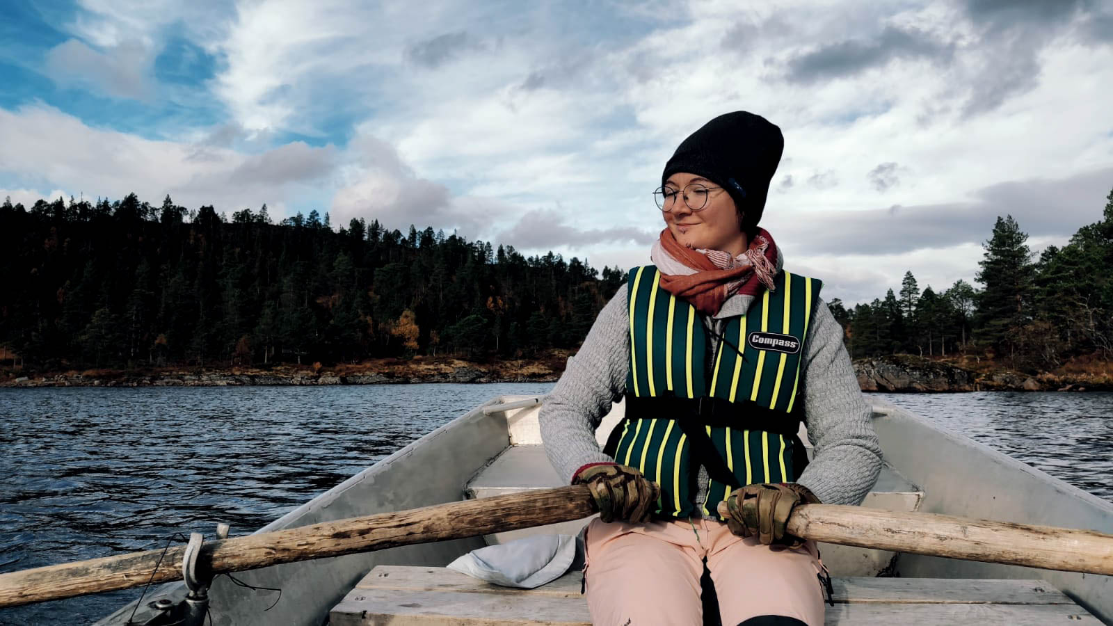 Die erste fliegenfreie Nacht geht zu Ende. Das Wetter wird schlechter, statt besser und sowohl Wind als auch Regen nehmen an Intensität zu. Glücklicherweise finden wir genug Internetempfang um die Wetterapp zu aktualisieren. Diese zeigt uns, dass Wind und Regen gegen 13 Uhr schwächer werden, was die Zeit unseres Aufbruchs festlegt. Wir frühstücken, spülen das Geschirr, ziehen das Bett ab, putzen die Hütte und versetzen sie in den Ursprungszustand zurück. Dann brechen wir auf zu unserer vorerst letzten Tour mit dem Ruderboot. Dieses Mal sind wir schnell und angstfrei am anderen Ufer und genießen diese letzte Fahrt trotz Wolkenberge und Wind.
