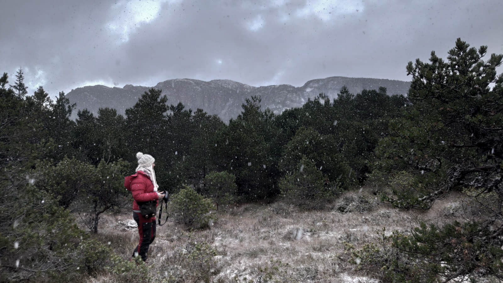 Die Berggipfel verstecken sich unter der weißen Last und die Bäume beugen sich dem Willen der Wolken, die über ihnen wachen. Weiß sollen die Berge werden, weiß und groß und stark in den Himmel aufragen. Unbeweglich unter der weißen Decke gefangen.
