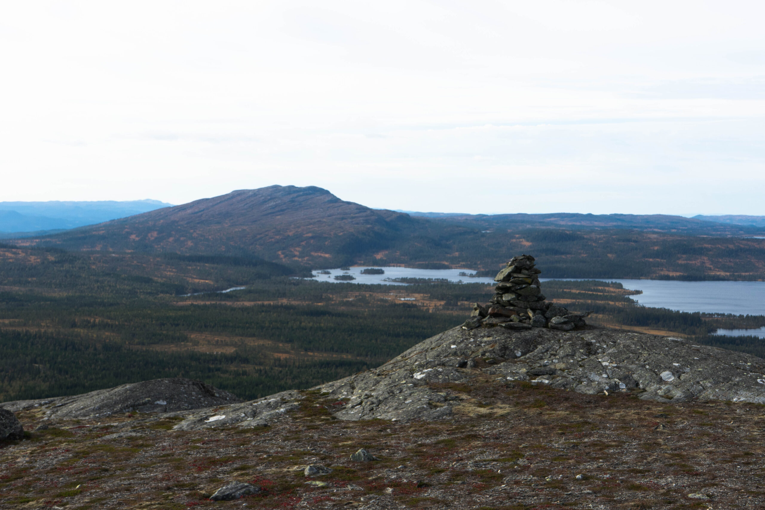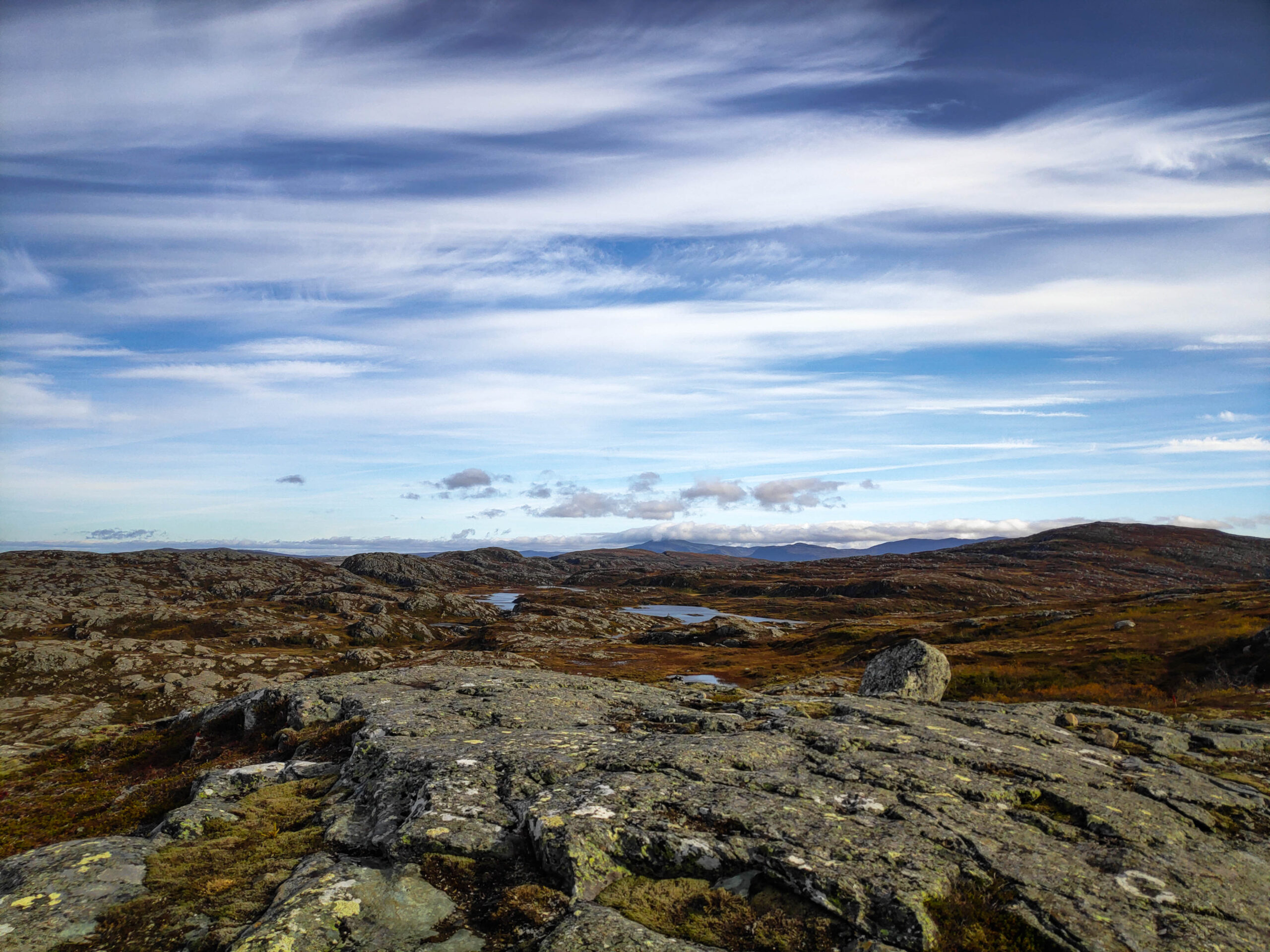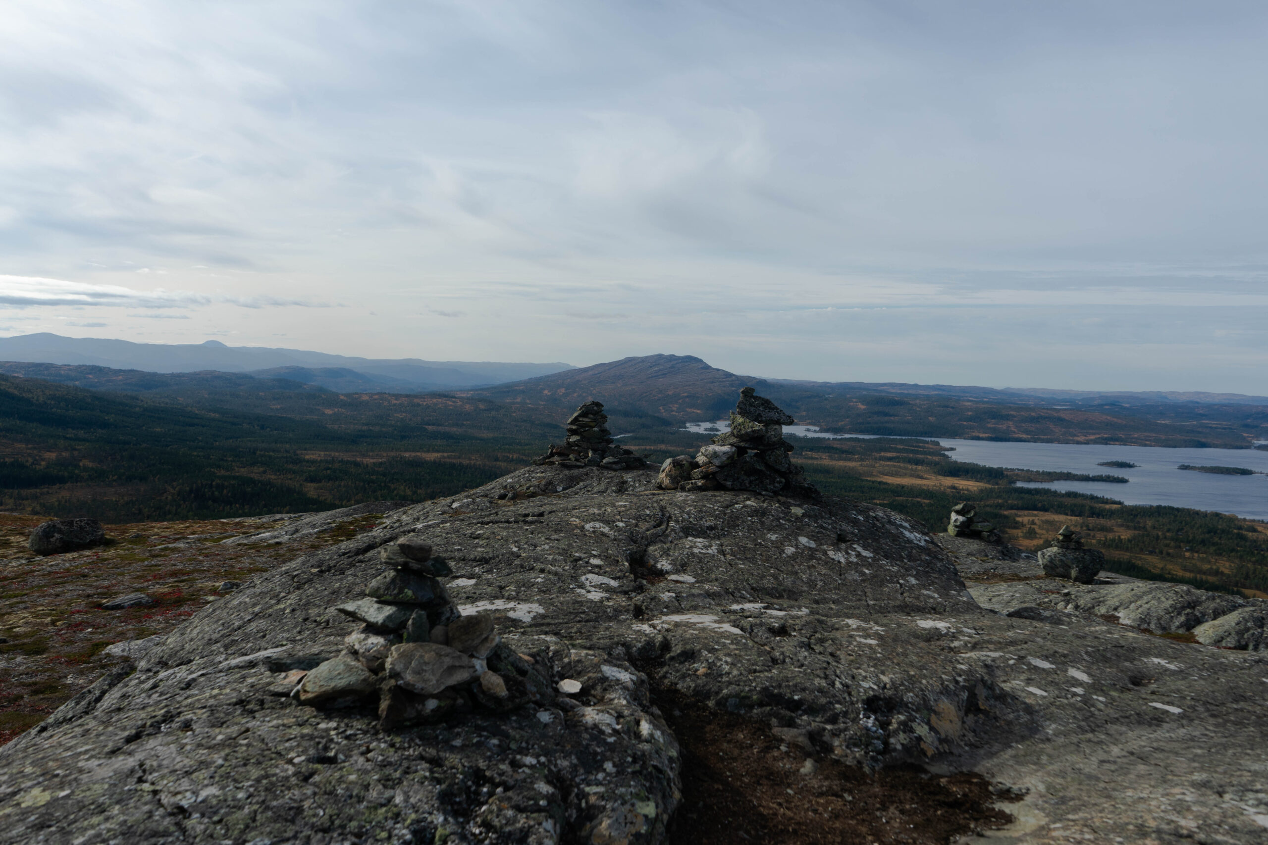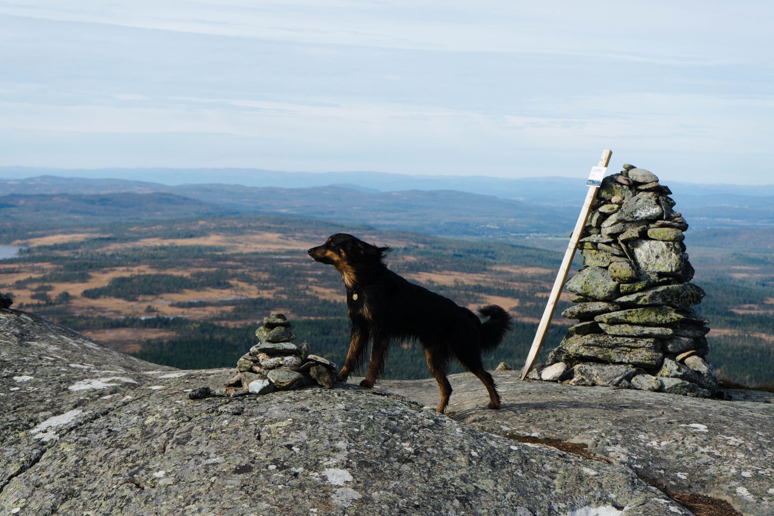 Lea hat viel Wandererfahrung und das ist auch gut so, denn für ihr Vorhaben nächstes Jahr wird sie diese brauchen. Gemeinsam mit Oscar wird sie im Sommer 2022 für 8 Wochen aus dem Süden Norwegens nach Hause wandern. Nach Hause bedeutet ca 1200 km gen Norden. 1200 km mit schwerem Gepäck, Hund und Zelt übers Fjell. Ich freue mich sehr für sie, dass sie dieses Abenteuer erleben darf und bewundere ihren Mut. Ich hätte diesen wahrscheinlich nicht aufgebracht. Schon der, im Gegensatz dazu bequeme, gut ausgebaute Jakobsweg hat mir viel Angst gemacht und der ist mit diesem Vorhaben nicht annähernd vergleichbar. Obwohl sie mir einige gewanderte Kilometer voraus ist passt sie sich gut meinem Tempo an und ich habe nie das Gefühl, hinter ihr her rennen zu müssen, zurück zu fallen oder ihr zu langsam zu sein wie das bei Marcel leider oft der Fall ist. Ich komme also tatsächlich auf dem Berggipfel an, ohne signalrot angelaufen zu sein und ohne Kurzatmigkeit. Atmen ist trotzdem schwierig denn es ist unglaublich windig. Sich zu unterhalten ist kaum möglich, der Wind trägt die Worte weit weg. Oscar stellt sich dem Sturm und blickt stolz auf die Welt unter ihm hinab. Lange hält es uns hier oben nicht, der Wind drängt sich in die Lunge und man kann ihn durch die Kleidungsschichten hindurch auf der Haut spüren. Man spürt etwas, das man nicht sehen kann. Da ist es trotzdem. An den arktischen Wind muss man nicht glauben um in ihm zu frieren.