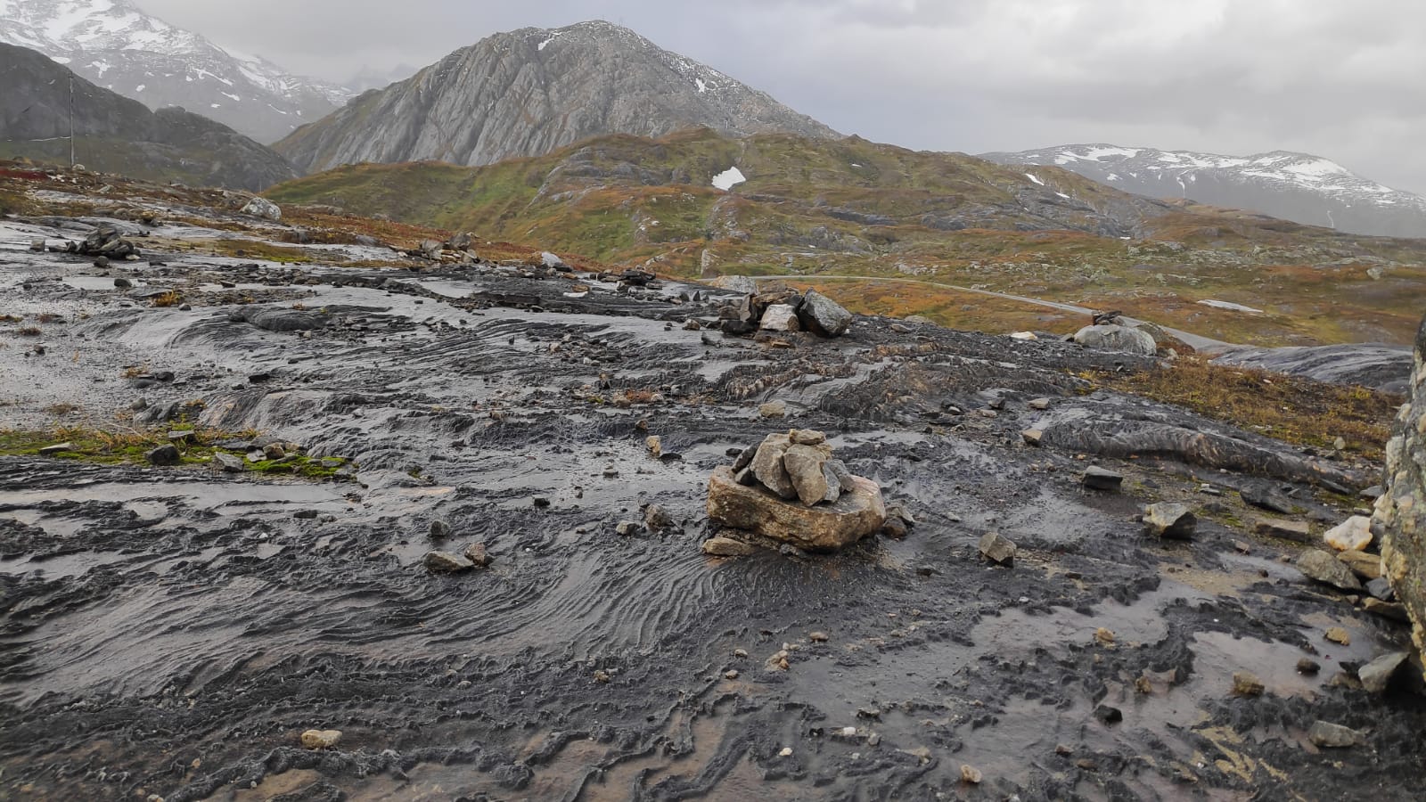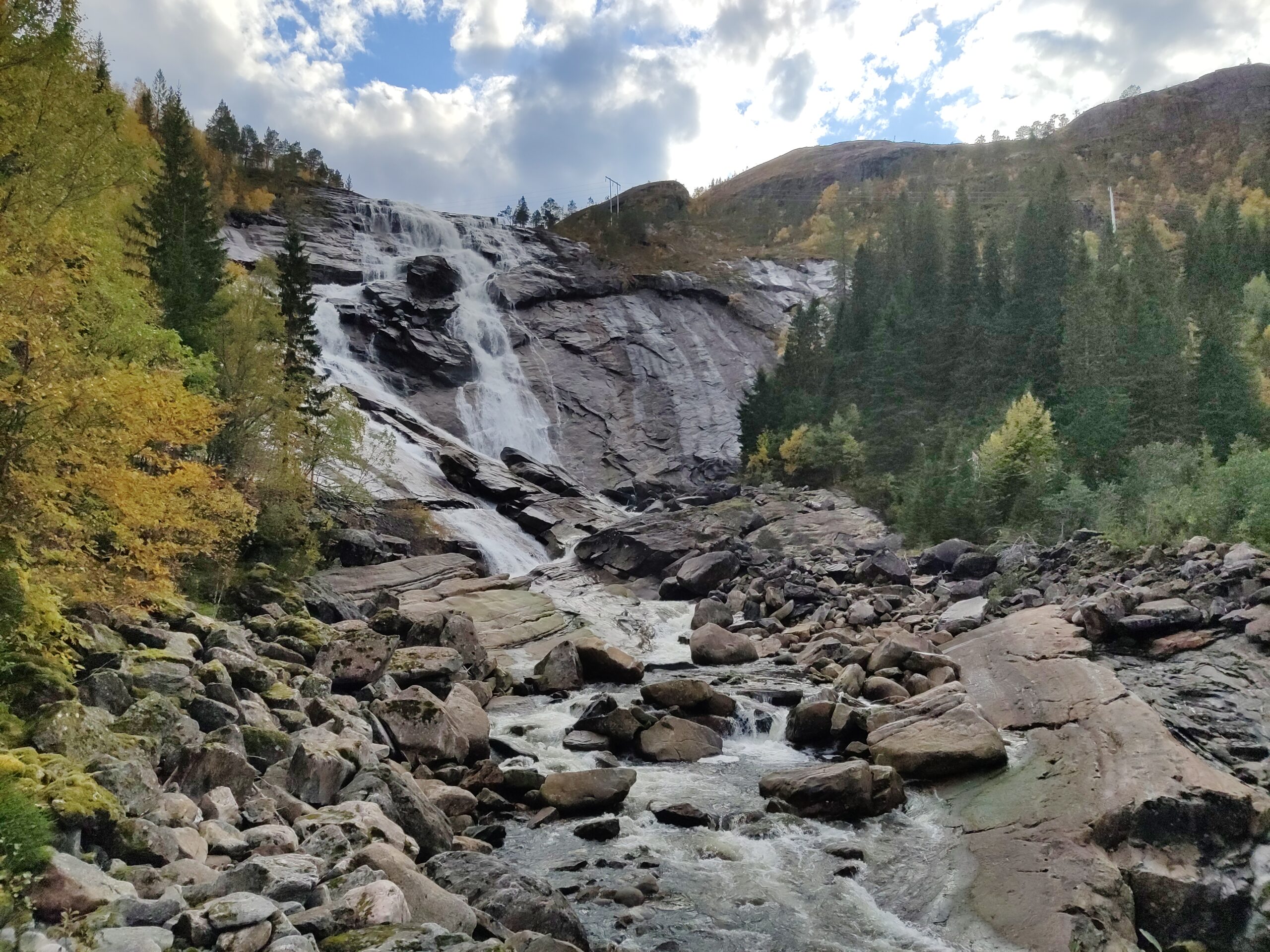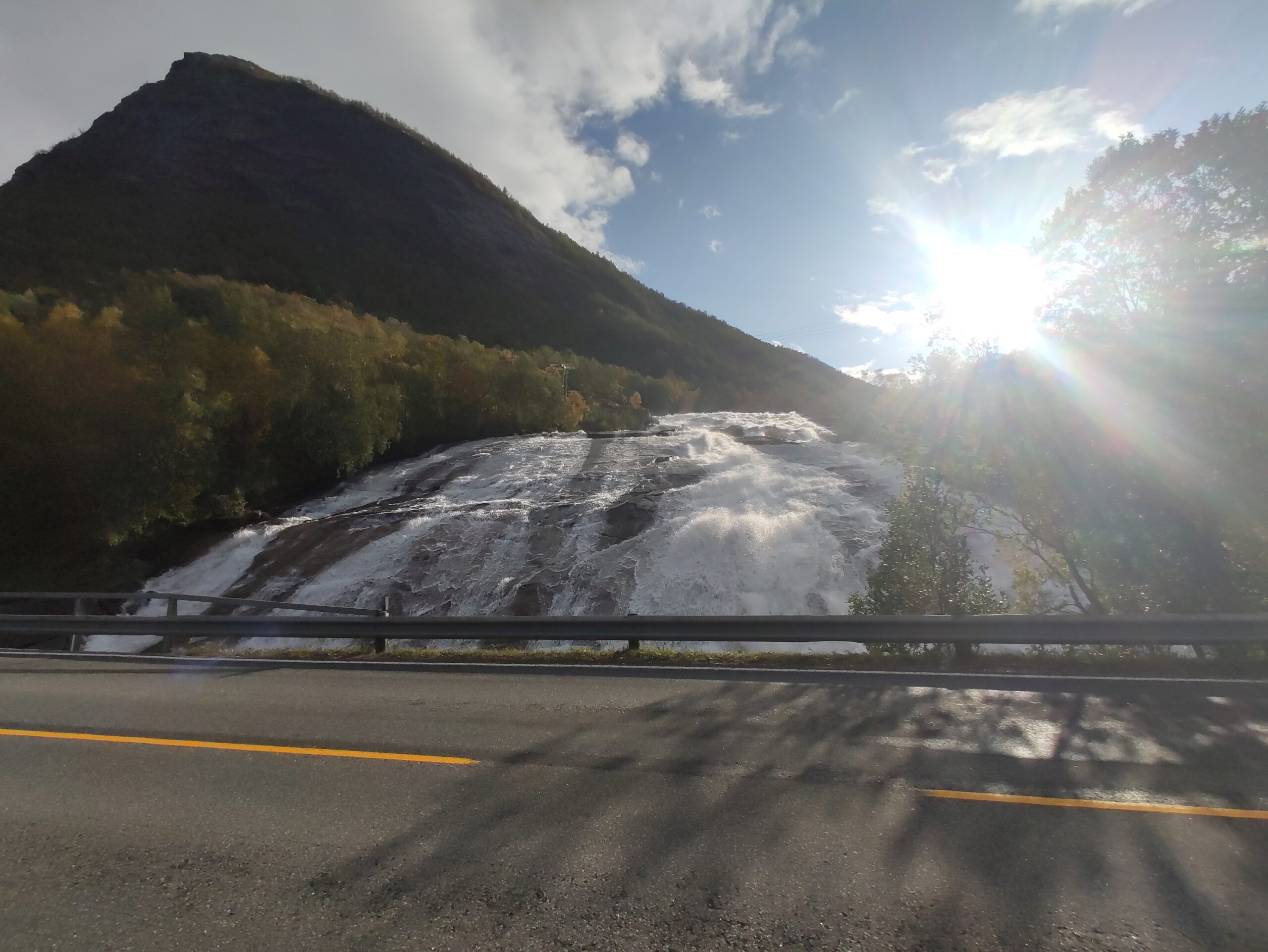 Überall sind Wasserfälle, die Natur ist orange und gelb, der Herbst verzaubert die Felsen, die rechts und links neben der Straße emporragen. Plötzlich erschrecken wir, als sich ein riesiger Staudamm aus Stein neben uns auftut. Vor dem Staudamm sind geflutete Gruften und schneebedeckte Gletscher.