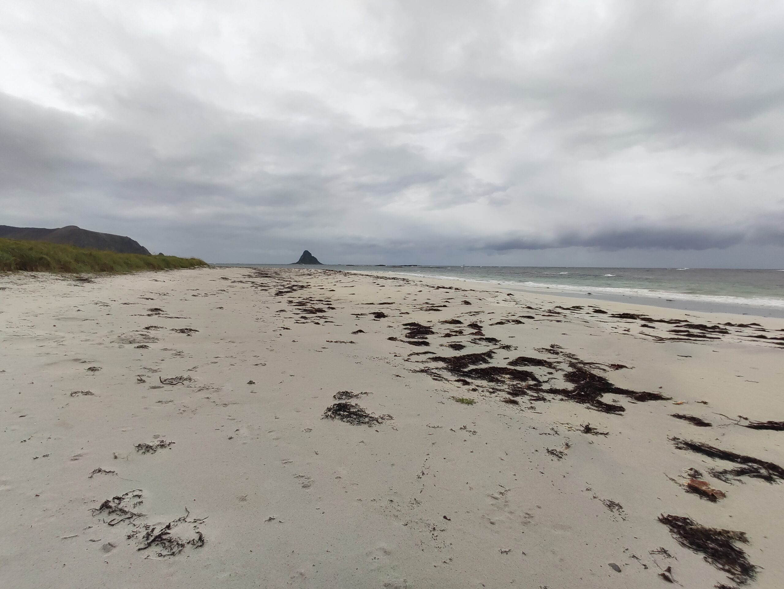 Verdorrtes Gras in den Dünen hinter uns zeugt von einem Leben vor Norwegens selbst gewählter Corona Isolation. Entstanden durch Abdrücke von Zelturlaubern, die den Sommer in Norwegen genießen durften. Nun sind nur noch die Schatten übrig, den Rest hat das Meer verschluckt und wenn man die Augen schließt, dann kann man hier und da noch ein fernes Lachen im Echo der See erahnen.
