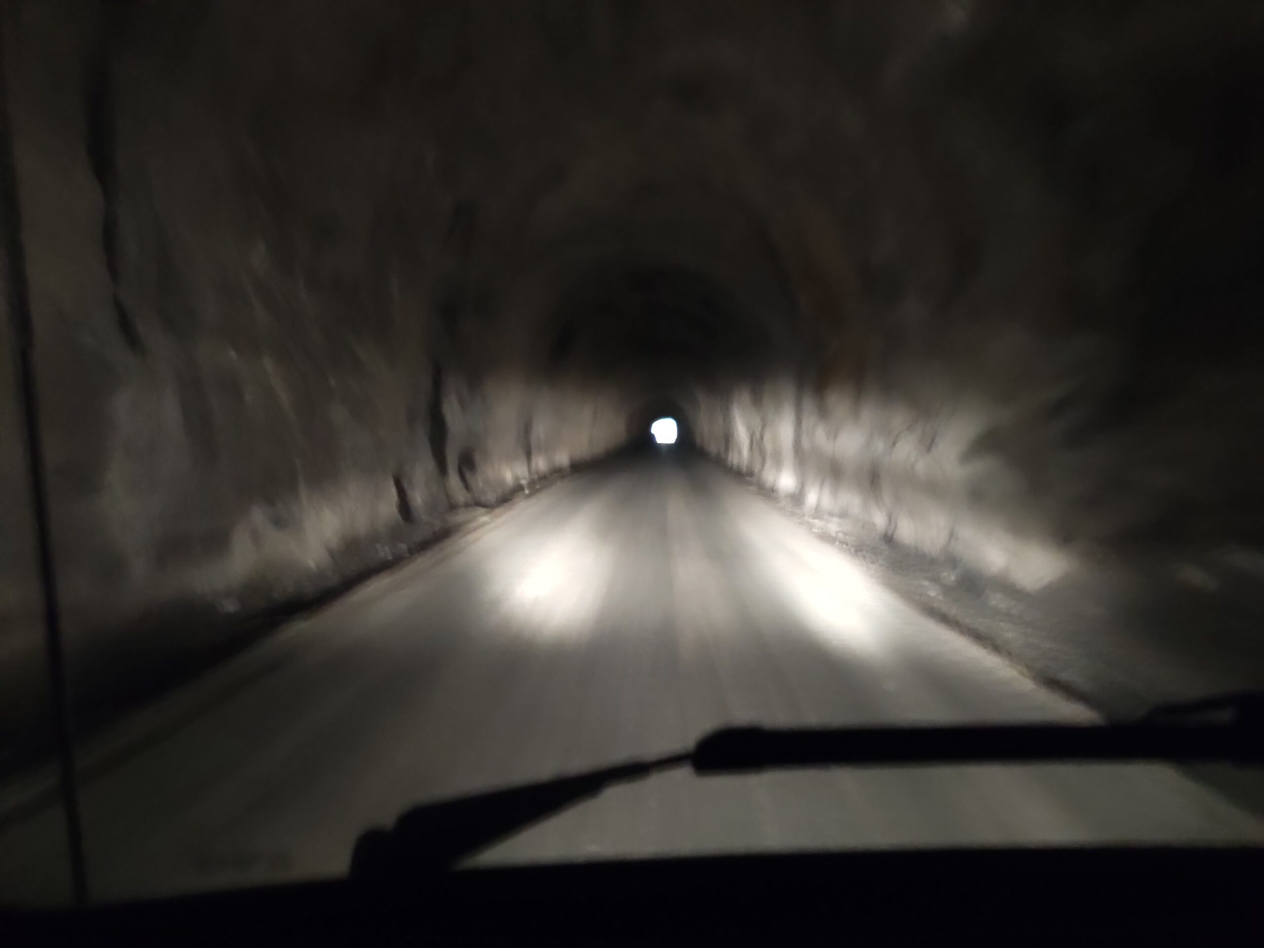 Die Straße wird enger und schlängelt sich an vielen Wasserfällen vorbei nach oben. Kurze Zeit später stehen wir vor dem Schild: Befahren auf eigene Gefahr, und blicken hinein in ein tiefes schwarzes Loch, das kein Ende zu nehmen scheint. Es ist der Tunnel zum Berggipfel, der eigentlich nur für Baustellenfahrzeuge befahrbar ist. Wir fahren hinein und uns blickt die Finsternis entgegen. Man verliert trotz Fernlicht schnell die Orientierung und erkennt nur anhand der Drehzahl, dass wir uns noch bewegen. Dank Google Maps bekommt man außerdem so eine ungefähre Ahnung, wann der Tunnel endet.