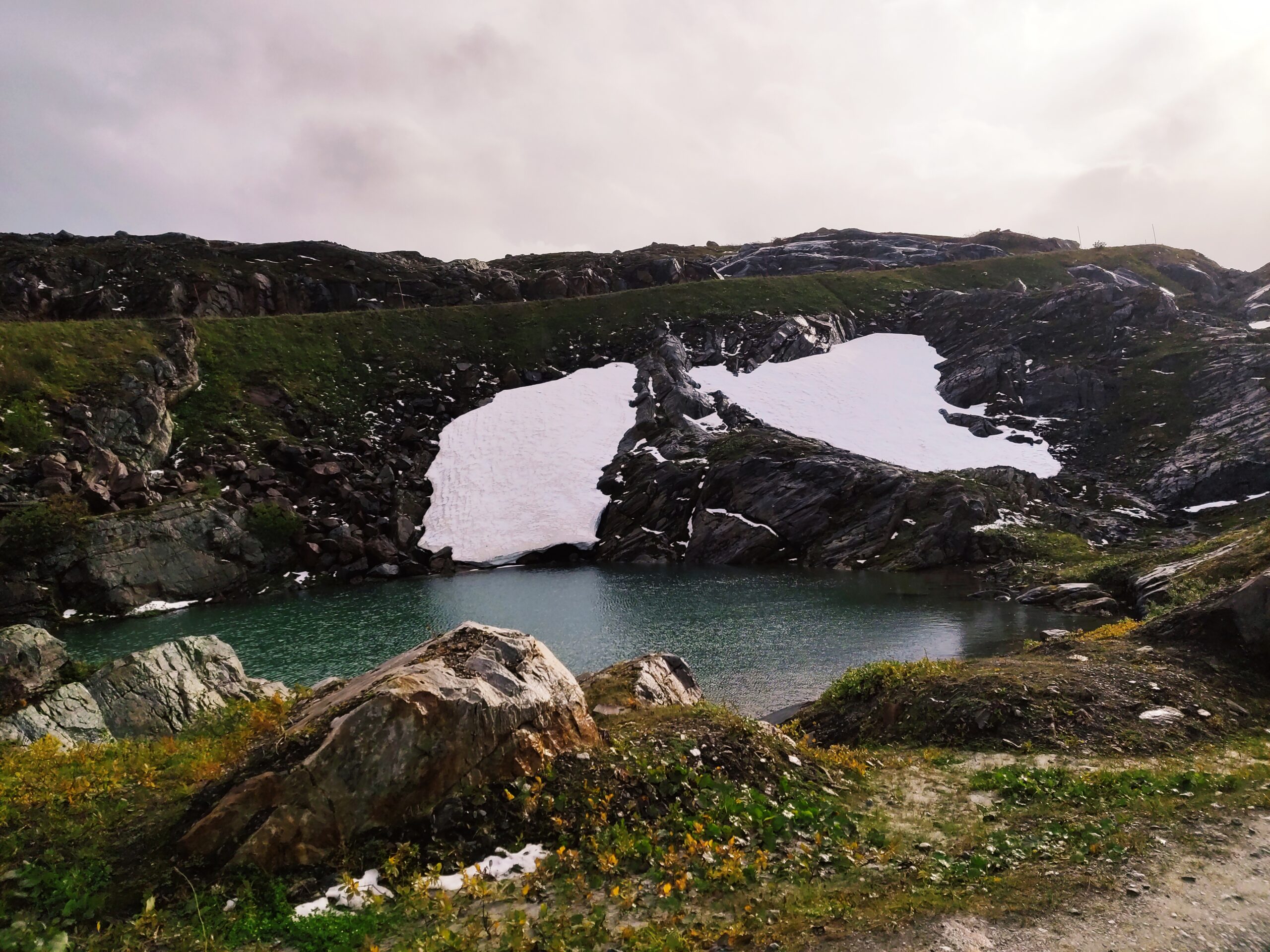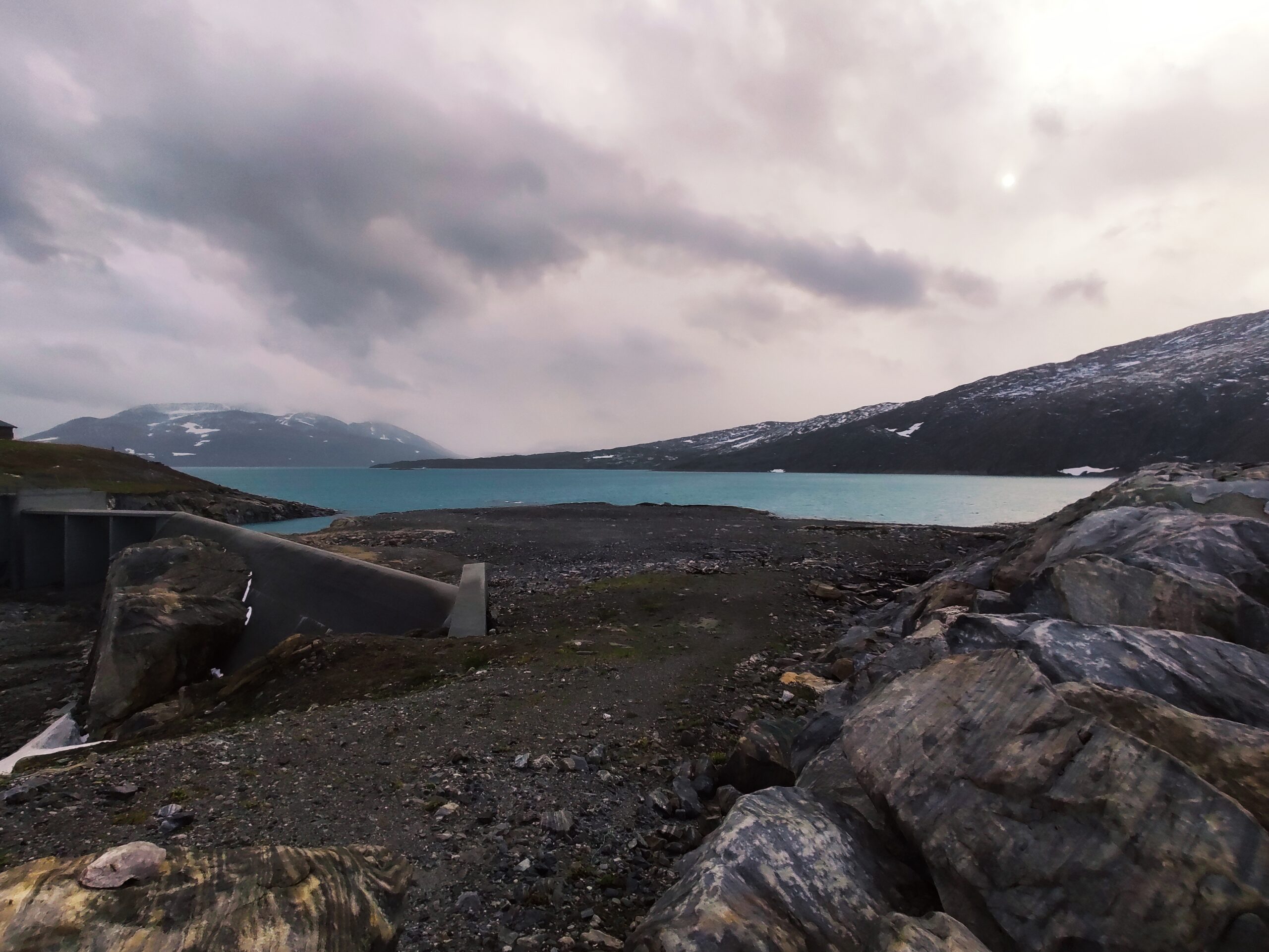 Je höher wir kommen desto kälter wird es. Wir sind jetzt auf dem Staudamm, über der Schneegrenze und es liegt überall um uns herum verteilt ein wenig Schnee. Der See, den der Damm anstaut, ist türkisblau und riesengroß. Die Felsbrocken auf dem Gipfel sind die Leinwand und das Wasser malt bunte Muster in sie hinein.