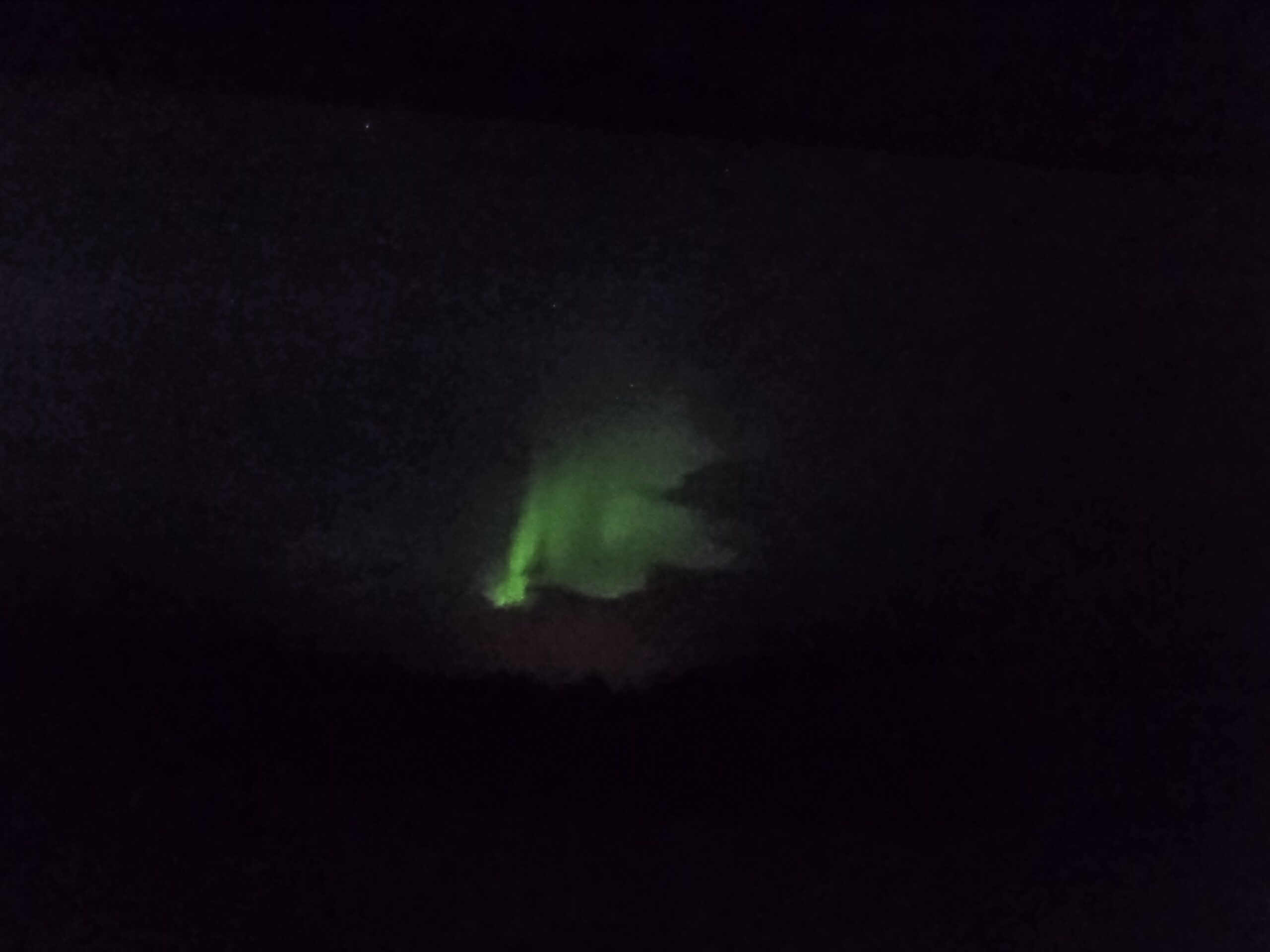Das Nordlicht ist am Himmel aufgetaucht, wieder nur sehr schüchtern aber deutlich wahrnehmbar hinter der Wolkendecke. Es hat sogar ganz kurz einmal für uns geflimmert.