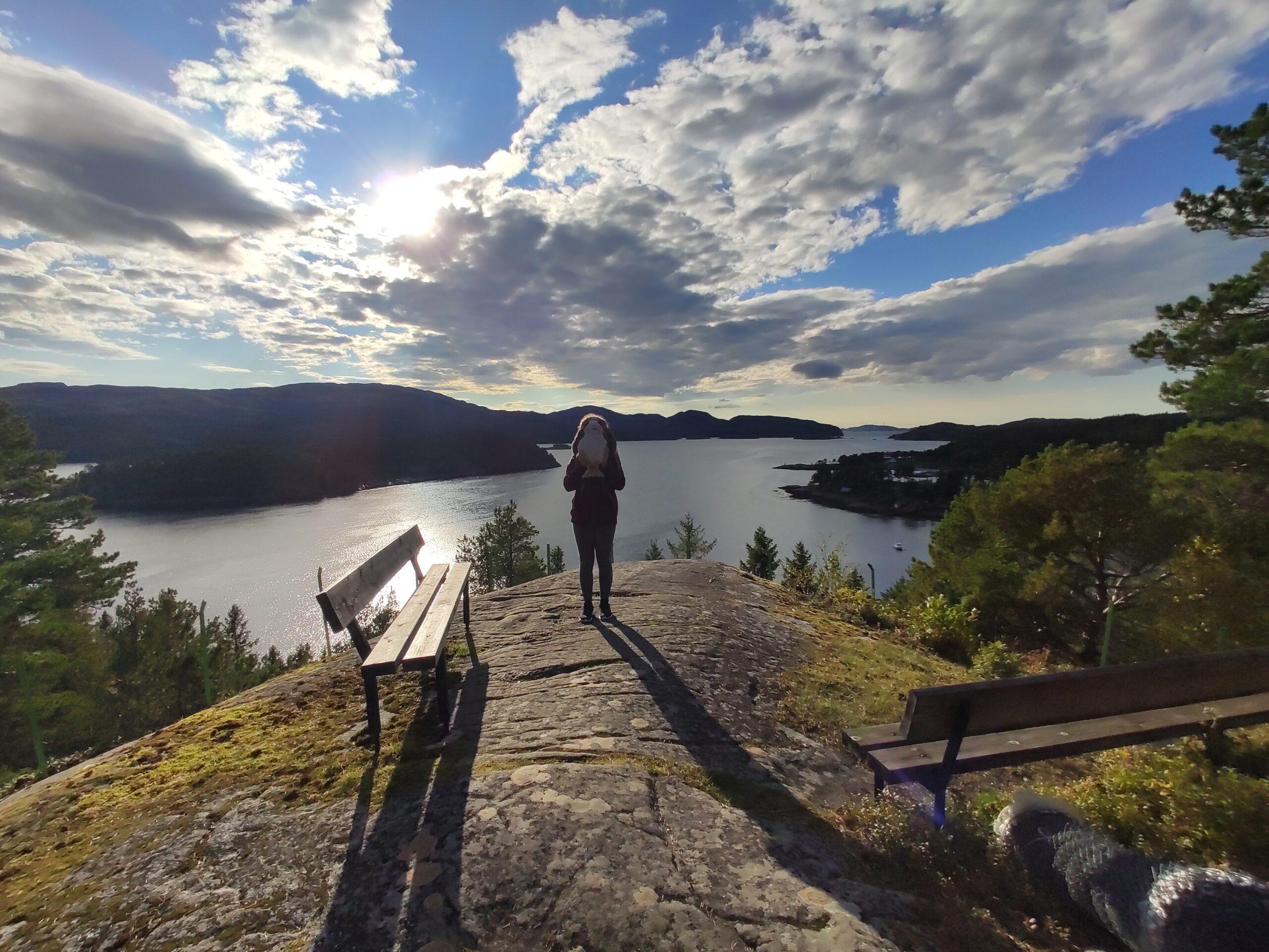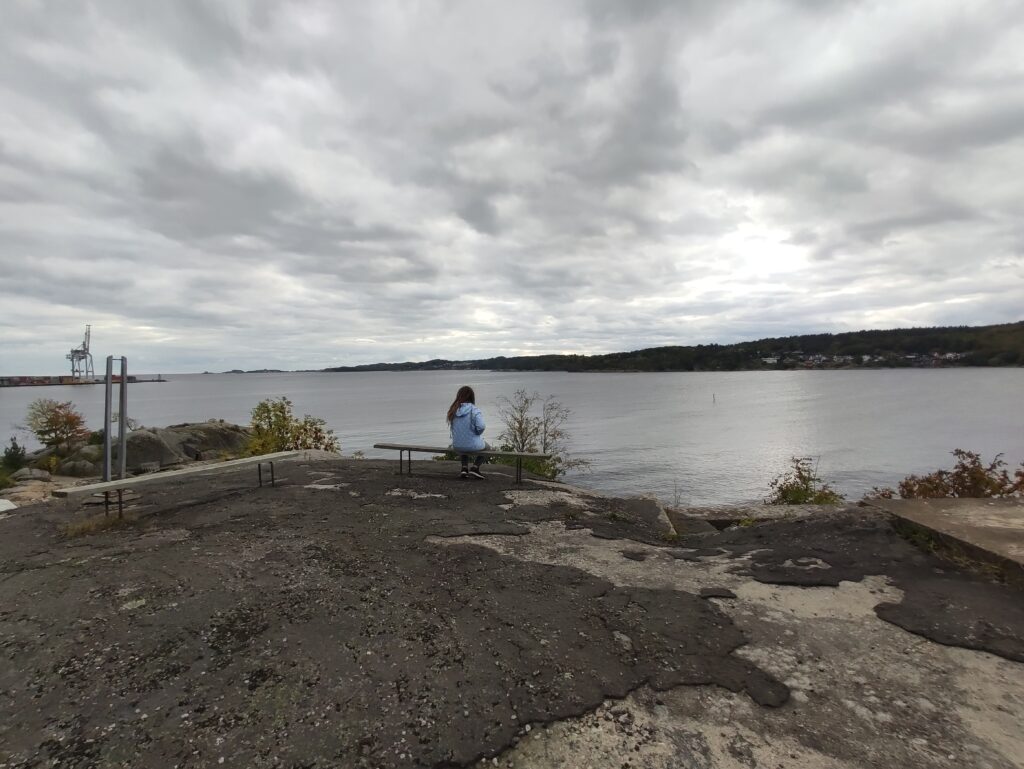 Dort hat jemand ein Herz in den Fels geritzt. Die Aussicht hier ist sehr schön und Norwegen würdig. Die Sonne bricht sich in einem einzigen Strahl durch die Wolken. Es sieht aus, als ob jemand von oben mit einem Laserschwert durch die Wolkendecke schneidet. Oder wie ein Scheinwerfer, der durch die Wolken strahlt. Larvik selbst ist leider nicht annähernd sehenswert und doch wird mir dieser Ort lange in Erinnerung bleiben. Dieser Tag, diese Stunde, dieses Gefühl und das Herz im kühlen Fels.